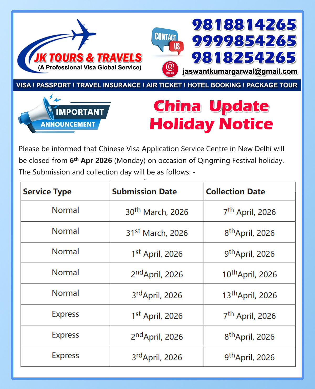Please be informed that Chinese Visa Application Service Centre in New Delhi will be closed from 6th Apr 2026 (Monday) on occasion of Qingming Festival holiday.